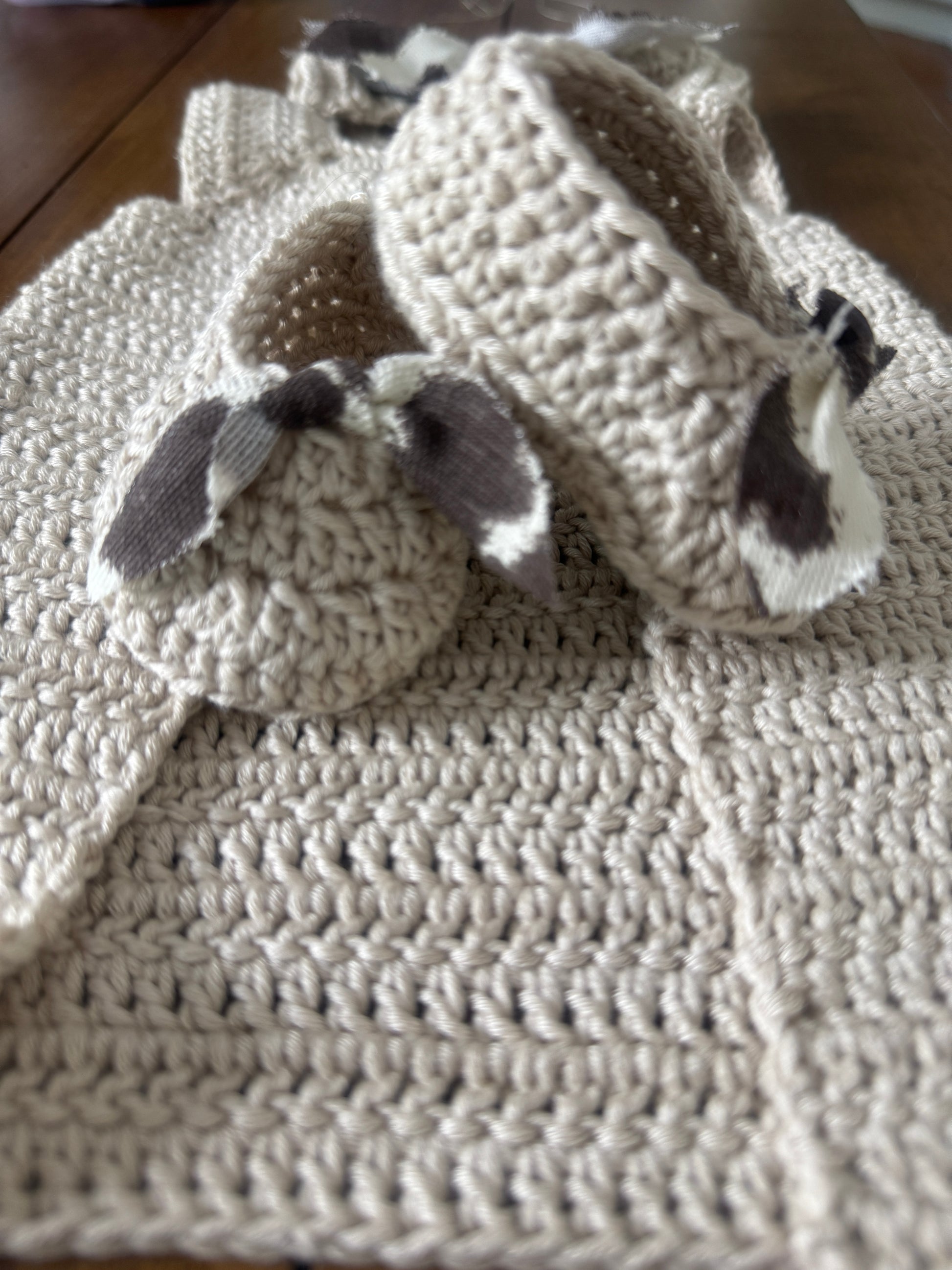 This handmade crochet four-piece baby set is crafted from 100% cotton, offering a soft, breathable, and adorably stylish outfit for little ones aged 0 to 6 months. Designed with comfort and charm in mind, the set includes a light crochet vest featuring a delicate button closure and sweet detailing, perfect for layering. The matching shorts are cozy and spacious, allowing room for diapers while providing a gentle stretch for easy movement. A soft, flexible headband with a bow adds a precious finishing touch, while the snug slippers—also adorned with tiny bows—keep baby’s feet warm and stylish.