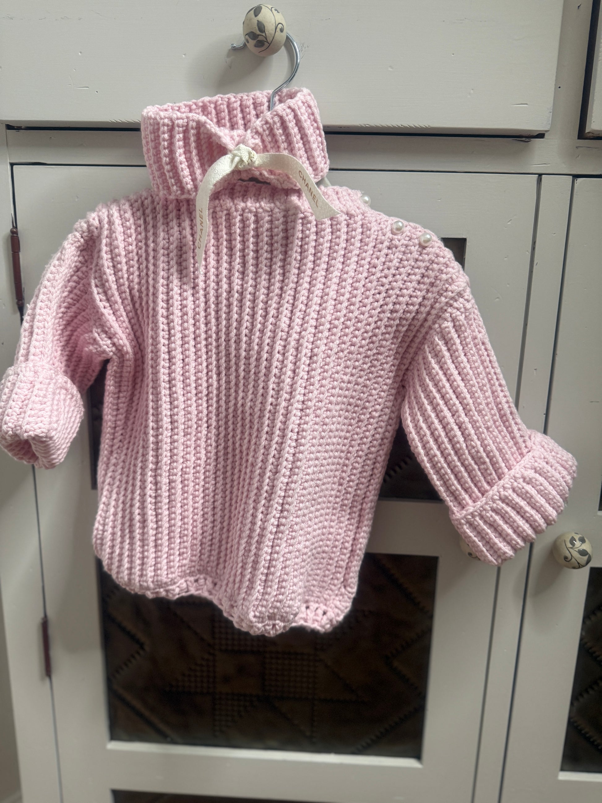 Wrap your little one in style and comfort with this beautifully handcrafted pink crochet sweater. Made from 100% soft cotton, it's perfect for a breezy evening stroll on the boardwalk or any cool summer night. The neckline is delicately lined with button-style pearls for a touch of elegance, and the set includes a matching headband adorned with authentic Chanel ribbon for a luxurious finish.